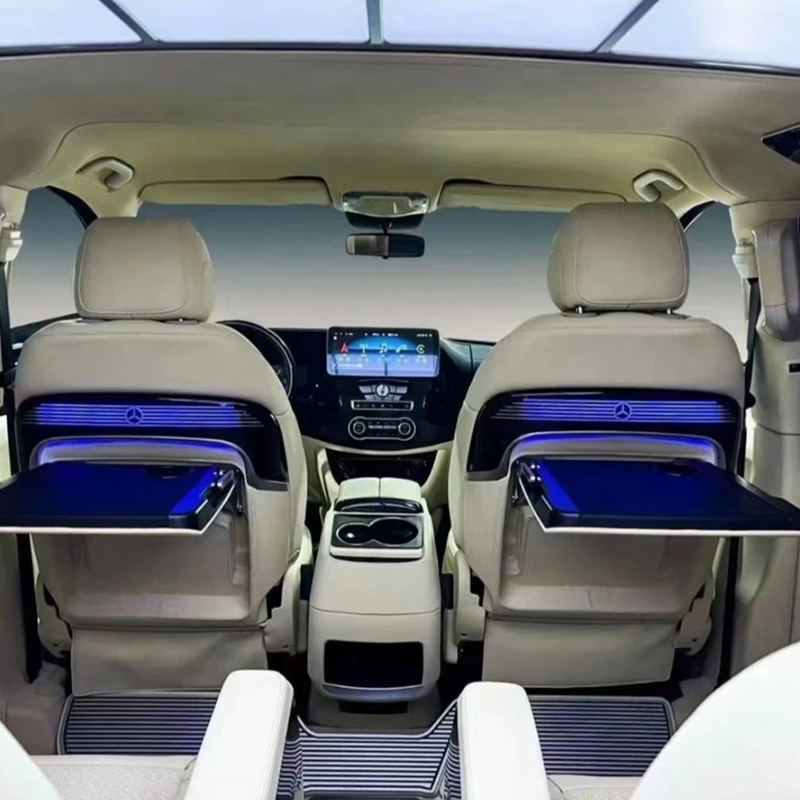 Ideal para viagens de negócios, serviços de transporte ou transporte VIP, esta modificação do encosto transforma o interior do seu Vito/Classe V num escritório móvel que combina perfeitamente funcionalidade, estilo e conveniência.