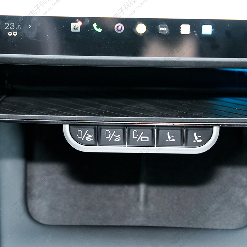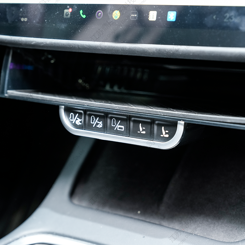 Cinco botões metálicos táteis estão bem dispostos abaixo da bandeja, proporcionando acesso intuitivo às funções essenciais do veículo. Cada botão responde com um clique tátil nítido, dando aos usuários uma sólida sensação de controle. As funções incluem abrir e fechar as portas dianteiras, os porta-malas dianteiro e traseiro e controlar a tampa da porta de carregamento – tudo acessível instantaneamente na ponta dos dedos.